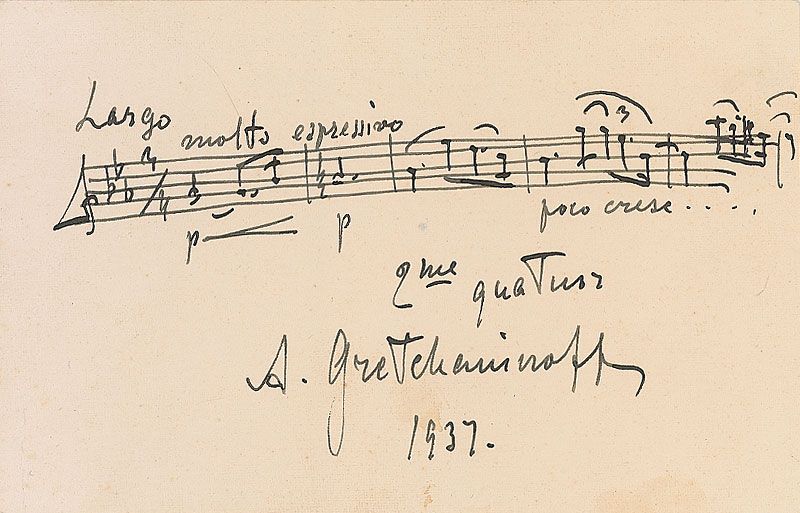Russian composer (1864–1956) who studied with Rimsky-Korsakov and produced five symphonies and many other pieces of orchestral, sacred, and chamber music. AMQS on an off-white 5.5 x 3.75 card, signed at the bottom in fountain pen, “A. Gretchaninoff, 1937.” Gretchaninoff pens five bars of slow music, which he labels as from his second quartet. In fine condition.