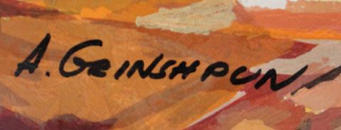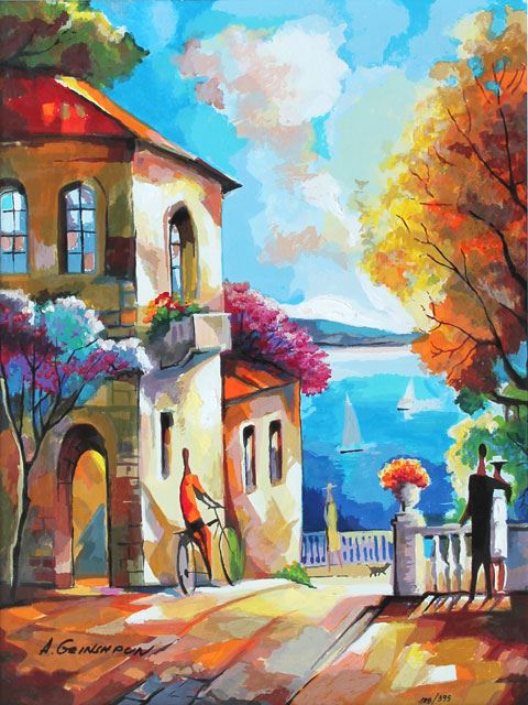 Artist: Alexander Grinshpun - Title: Afternoon Stroll - Medium: Serigraph on Wood - Signature: Hand-signed by the Artist - Limited Edition: 395 - Image Size: Approximately 16.5 inches x 13 inches - Unframed - Details: This work comes with a Certificate of Authenticity - Alexander Grinshpun?s style is not made on a single level, but has an unexpected element. It is multi colored art filled with conflicts.