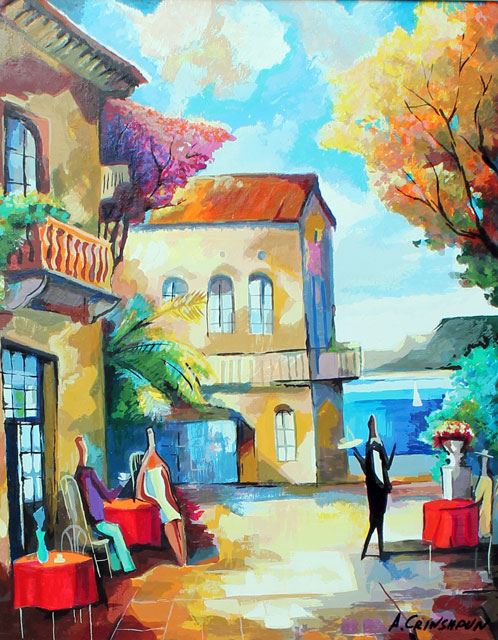 Artist: Alexander Grinshpun - Title: Happy Hour by the Bay - Medium: Serigraph on Wood - Signature: Hand-signed by the Artist - Limited Edition: 395 - Image Size: Approximately 16.5 inches x 13 inches - Framed: Unframed - Details: This work comes with a Certificate of Authenticity - Alexander Grinshpun?s style is not made on a single level, but has an unexpected element. It is multi colored art filled with conflicts.