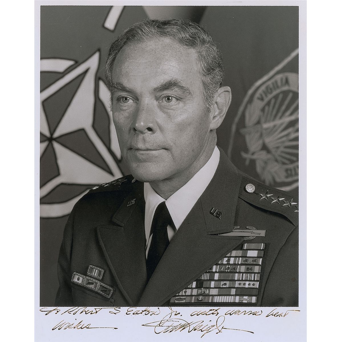 Army general (1924–2010) who served as secretary of state under Ronald Reagan and chief of staff under Richard Nixon and Gerald Ford. Glossy 8 x 10 photo of Haig in his military uniform, signed and inscribed in the lower border in fountain pen, “To Robert S. Eaton, Jr., with warm best wishes, A. M. Haig, Jr.” In fine condition.