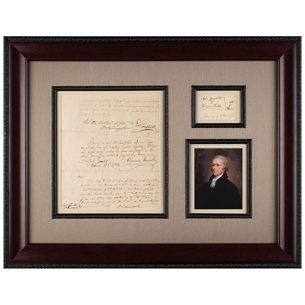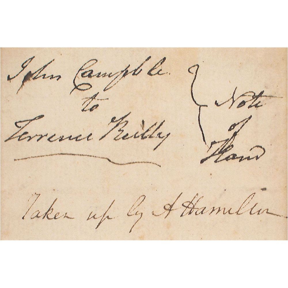 The reverse is docketed “John Campbell to Terrance Reilly, Note of Hand,†under which Hamilton himself has written, “Taken up by A. Hamilton.†Beautifully double-matted and framed with a color copy of the docketing panel and a portrait of Hamilton to an overall size of 24.5 x 19. In very good to fine condition, with intersecting folds, and overall light creasing.