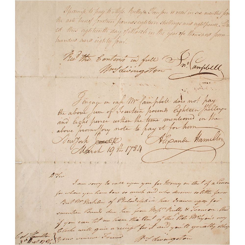 ADS, signed twice, "Alexander Hamilton" and "A. Hamilton," one page, 8 x 9.25, March 19, 1784. Document featuring a handwritten pledge by Hamilton to guarantee funds lent to John Campbell, a merchant and weaver who was engaged in smuggling British textile manufacturing machinery to the United States. At the top, Campbell endorses a manuscript promissory note: "I promise to pay to Mess. Reilly & Tronson or order in six months from the date hereof fourteen pounds, eighteen shillings and eight pence. Dated this eighteenth day of March in the year one thousand seven hundred eighty four." At center, Hamilton pens his personal guarantee, in full: "I engage in case Mr. Campbell does not pay the above sum of fourteen pounds, eighteen shillings and eight pence within the time mentioned in the above promissory note to pay it for him. Alexander Hamilton, New York, March 19th, 1784."
