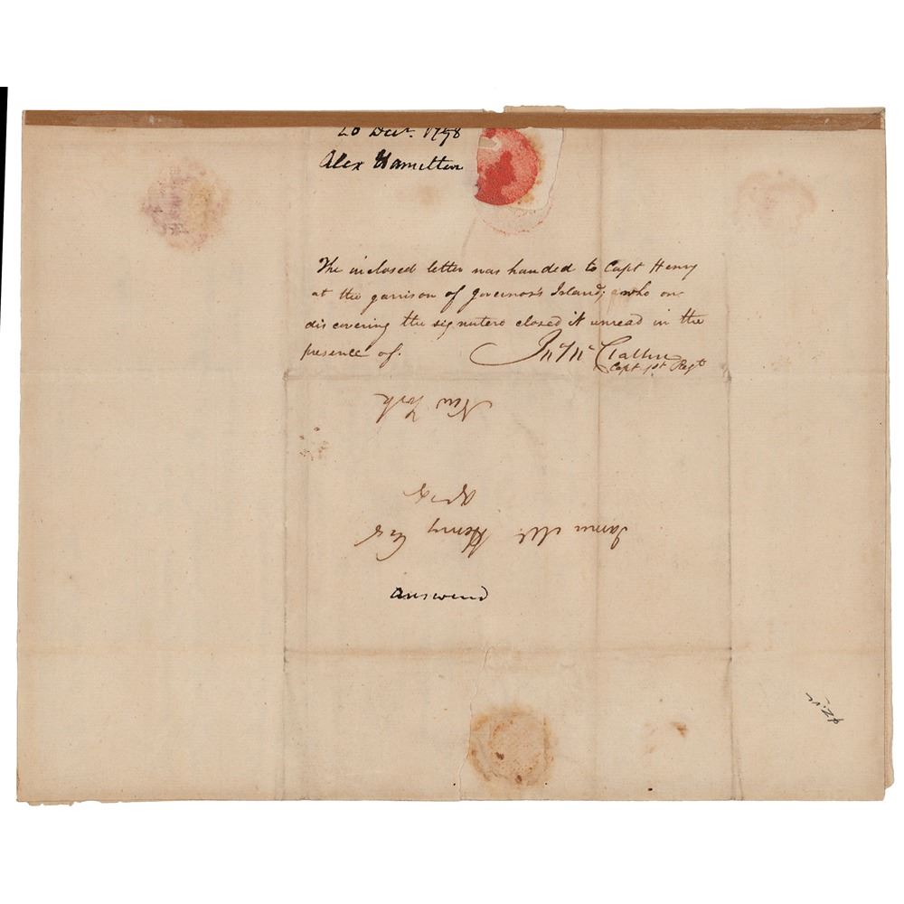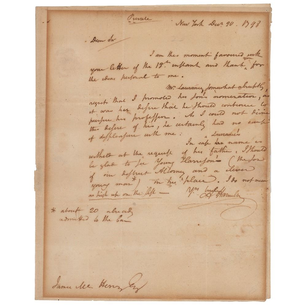 ALS signed “A. Hamilton,” one page, 8 x 10, December 20, 1798. Handwritten letter by Alexander Hamilton to Secretary of War James McHenry, marked "Private," written by Hamilton in his capacity as Inspector General of the Army. In full: "I am this moment favoured with your letter of the 18th instant and thank you for the ideas personal to me. Mr. Laurance, somewhat abruptly, regrets that I promoted his son's nomination, as it was his desire that he should continue to pursue his profession. As I could not divine this desire of his, he certainly had no cause of displeasure with me. In case Laurance's name is witheld at the request of his father, I should be glad to see Young Harrison (the son of our district Attorney and a clever young man—about 20 already admitted to the bar) in his place. I do not mean as high up on the list." Addressed on the reverse in Hamilton's hand, and annotated by a captain of the first regiment. In fine condition, with light toning from prior display, and seal-related paper loss to the integral address leaf.
