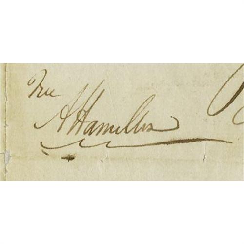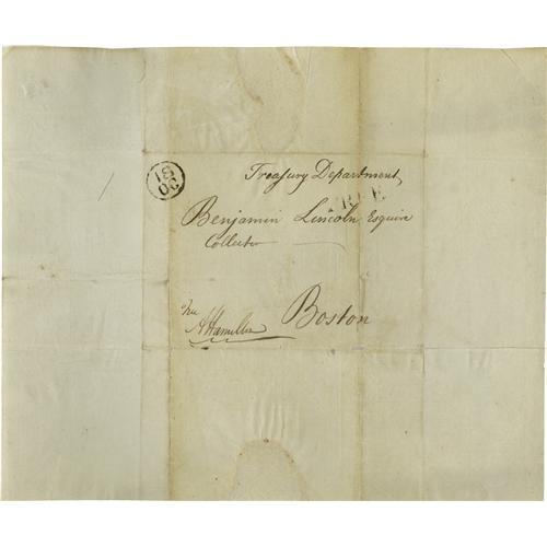 <B> Alexander Hamilton Free Franked Envelope. </B></I> Signed: "<I>Free, A. Hamilton.</B></I>" Measures 7.5" x 9", addressed to Benjamin Lincoln Esquire Collector, from the Treasury Department. Alexander Hamilton held the office of Secretary of Treasury from 1789 to 1795. <BR><BR> The envelope is in very good condition; some professional conservation measures have been taken- Chinese paper on the tear which was made by the wax seal being torn; usual folds are present; soiling and yellowing along the fold lines.
