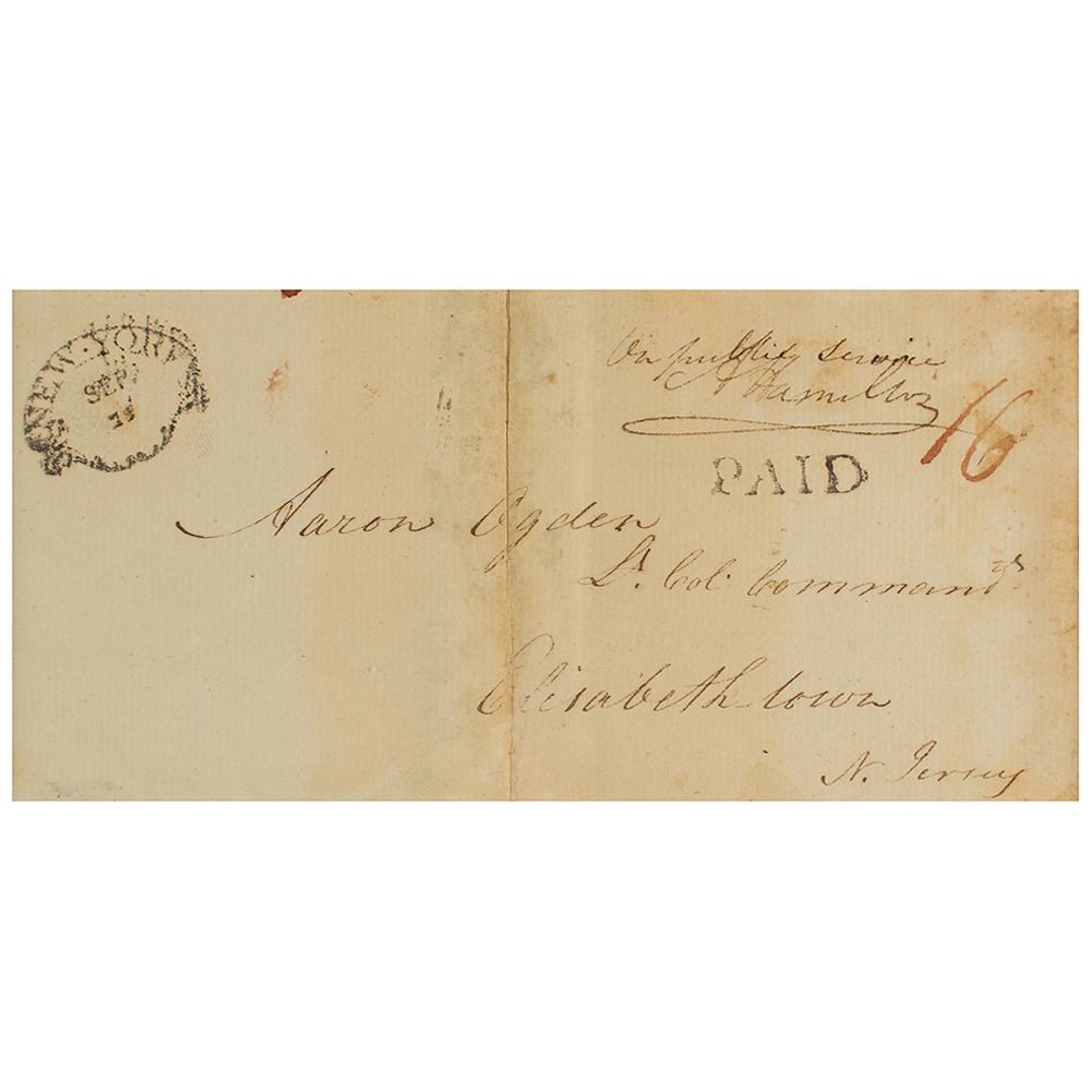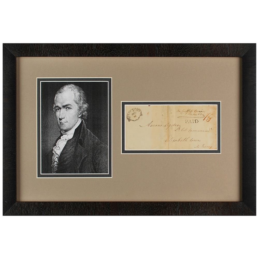Mailing envelope addressed in the hand of Alexander Hamilton, 6.5 x 3, addressed to "Aaron Ogden, Lt. Col. Command'r, Elizabethtown, N. Jersey," with Hamilton adding his franking signature to the upper right, "On public service, A. Hamilton." Stamp-dated at New York in September (no year). Archivally double-matted and framed with a portrait to an overall size of 18 x 12.25. In very good to fine condition, with light staining to the right edge, and along the (possibly separated) central vertical fold.