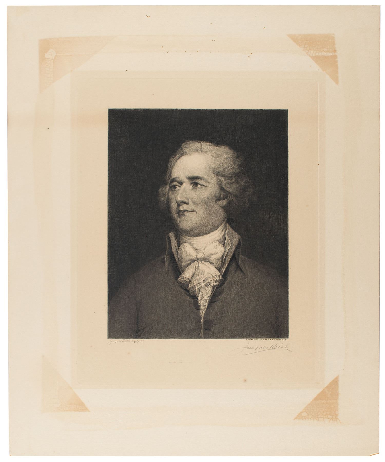 Scarce print of Alexander Hamilton by Hungarian portrait etcher Jacques Reich, 14.5 x 17.75, signed in the lower right in pencil by the artist. Published by G. P. Putnam & Sons in 1904. Affixed to a same-size cardstock mount. In very good to fine condition, with toning from prior display, easily matted out.