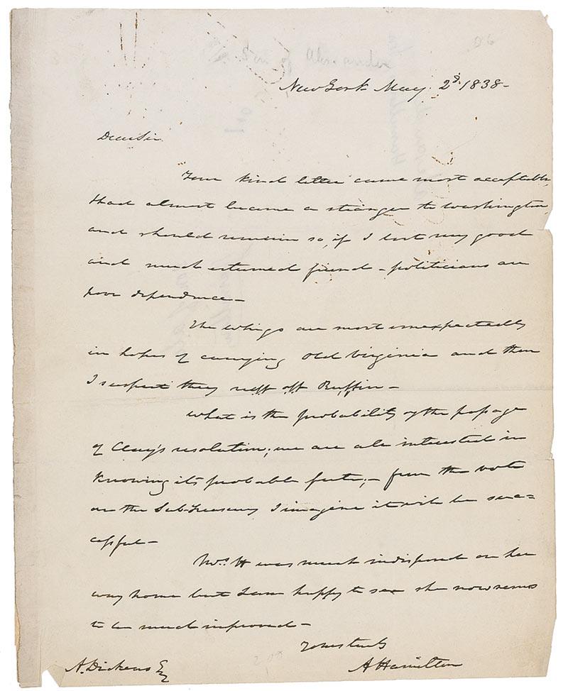 Attorney (1786–1875) and son of Alexander Hamilton who served in the War of 1812 and later as US district attorney in Florida and as land commissioner. ALS signed “A. Hamilton,” one page, 8.25 x 10.25, March 2, 1838. In part: “The Whigs are most unexpectedly in hopes of carrying Old Virginia and then I suspect they will.” In very good condition, with mild to moderate creasing, toning, edge chipping, and scattered paperclip rust stains.