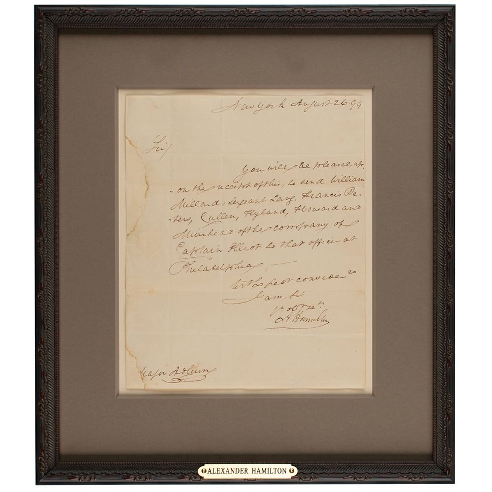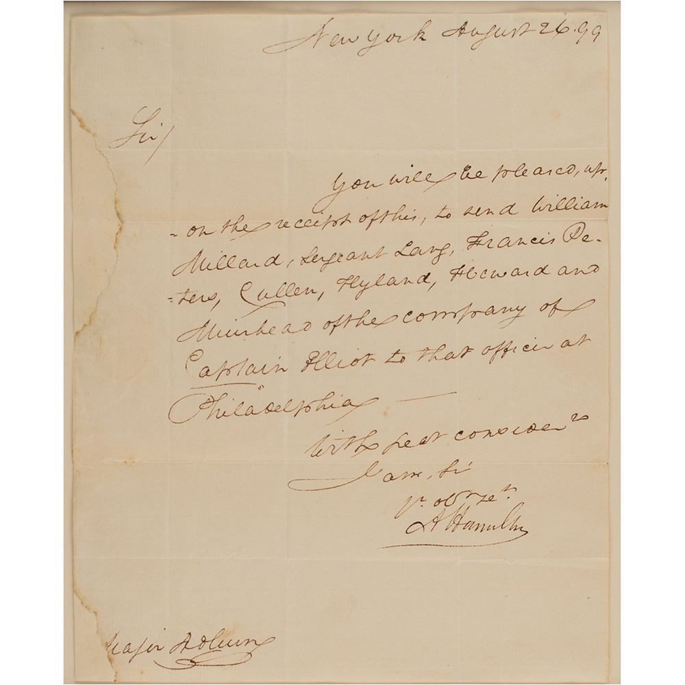LS signed “A. Hamilton,†one page, 7.25 x 9, August 26, 1799. Letter to a major, in part: "You will be pleased, upon the receipt of this, to send William Millard, Sergeant Lang, Francis Peters, Cullen, Hlyland, Fleward…of the company of Captain Elliot to that office at Philadelphia." Mounted, matted, and framed to an overall size of 12.75 x 14.75. In very good to fine condition, with paper loss to the left edge, and multiple intersecting folds. Hamilton served as Inspector General of the Army with rank of major general from July 19, 1798 to December 14, 1799, when he became senior officer in the Army after the death of Washington. A desirable, neatly signed letter by Hamilton as he organizes his troops.