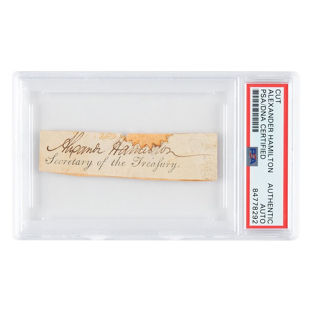 Sought-after ink signature as Secretary of the Treasury, "Alexander Hamilton,& rdquo; on an off-white 3.25 x .75 slip imprinted with his historic title. In very good to fine condition, with light soiling, a tiny chip to the top edge, and a partial seal touching the signature. As the United States& #39; first Treasury Secretary, Hamilton promoted a national banking system, established the United States Mint, enacted economic reforms aimed at promoting American industry, and crafted monetary policies that assured financial security for the new nation. A bold and crisp autograph by the popular and influential statesman. Encapsulated in a PSA/DNA authentication holder.