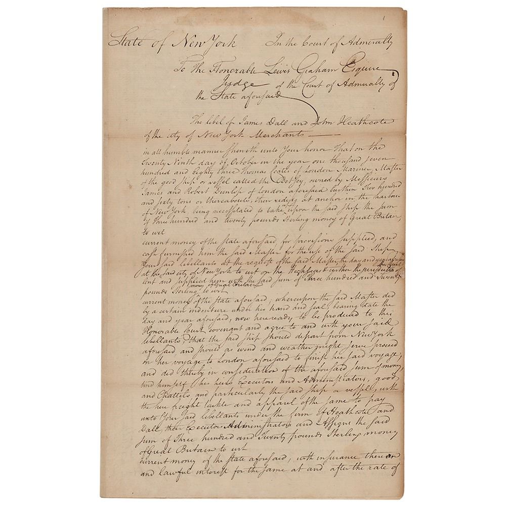 ADS, signed “Hamilton Proctor for Libellants,” three pages on adjoining sheets, 8 x 13, no date but circa 1783. Lengthy handwritten legal document by Alexander Hamilton, being a lawsuit addressed to Lewis Graham, Judge in the Court of Admiralty, made on behalf of James Dall and John Heathcote against Thomas Coates, master of the ship "Betsey," for non-payment of a loan of one thousand pounds.