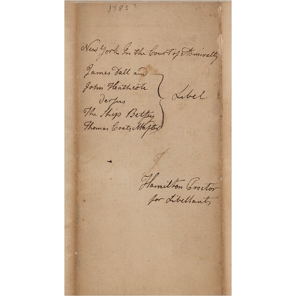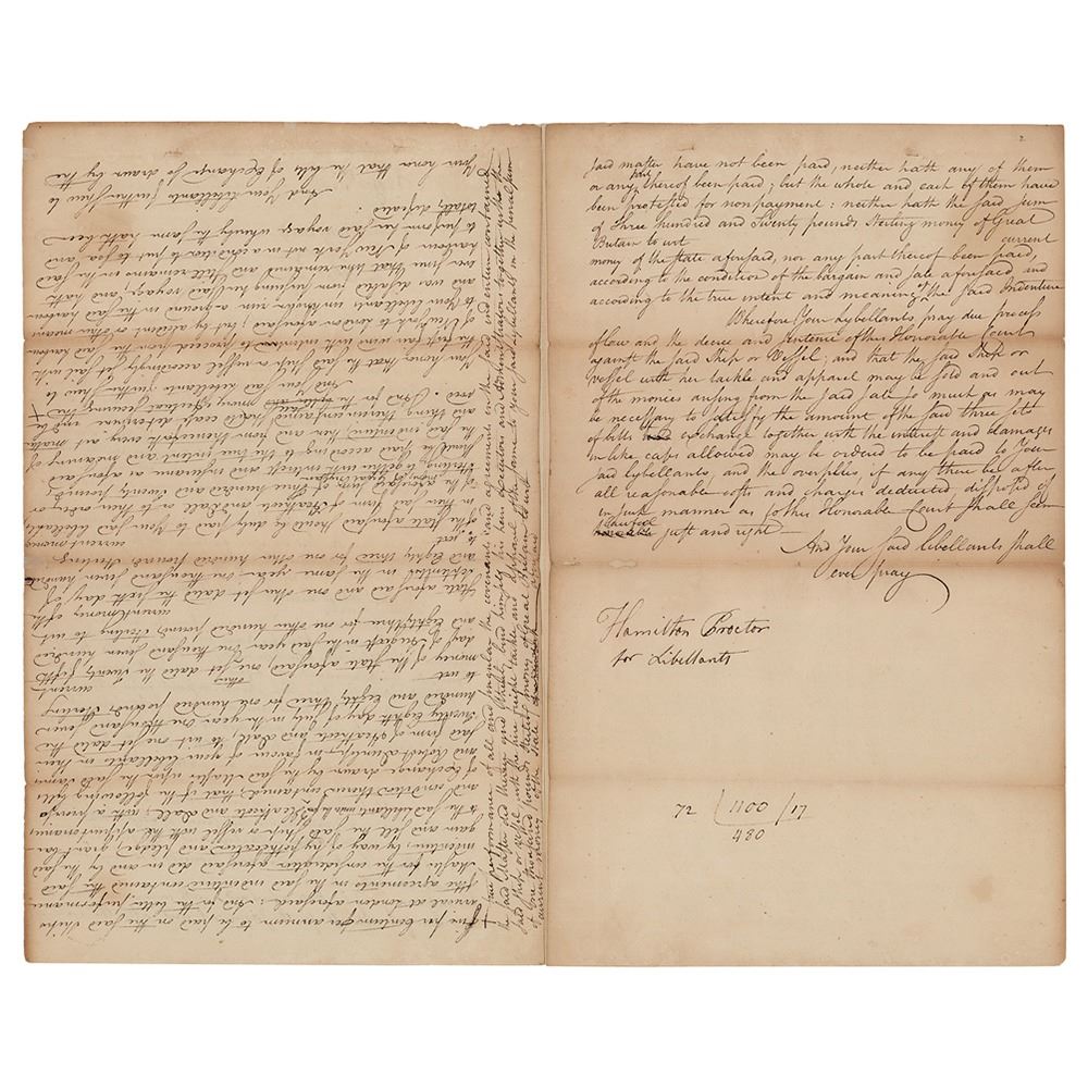 Hamilton concludes the complaint: "Wherefore your Lybellants pray due process of law and the decree and sentence of this Honorable Court against the said ship or vessel; and that the said Ship or vessel with her tackle and apparel may be sold and out of the monies arising from the said sale much as may be necessary to satisfy the amount of the said three sets of bills and exchange together with the interest and damages in like cases allowed may be ordered to be paid to your said Lybellants and the overplus, if there be after all reasonable costs and charges deducted disposed of in such manner as to this Honorable Court shall seem honorable lawful just and right." Hamilton signs at the conclusion, "Hamilton Proctor for Libellants," and signs again in the same manner on the docketing panel. In fine condition, with light toning to the edges and folds, and professional repairs to very minor losses.