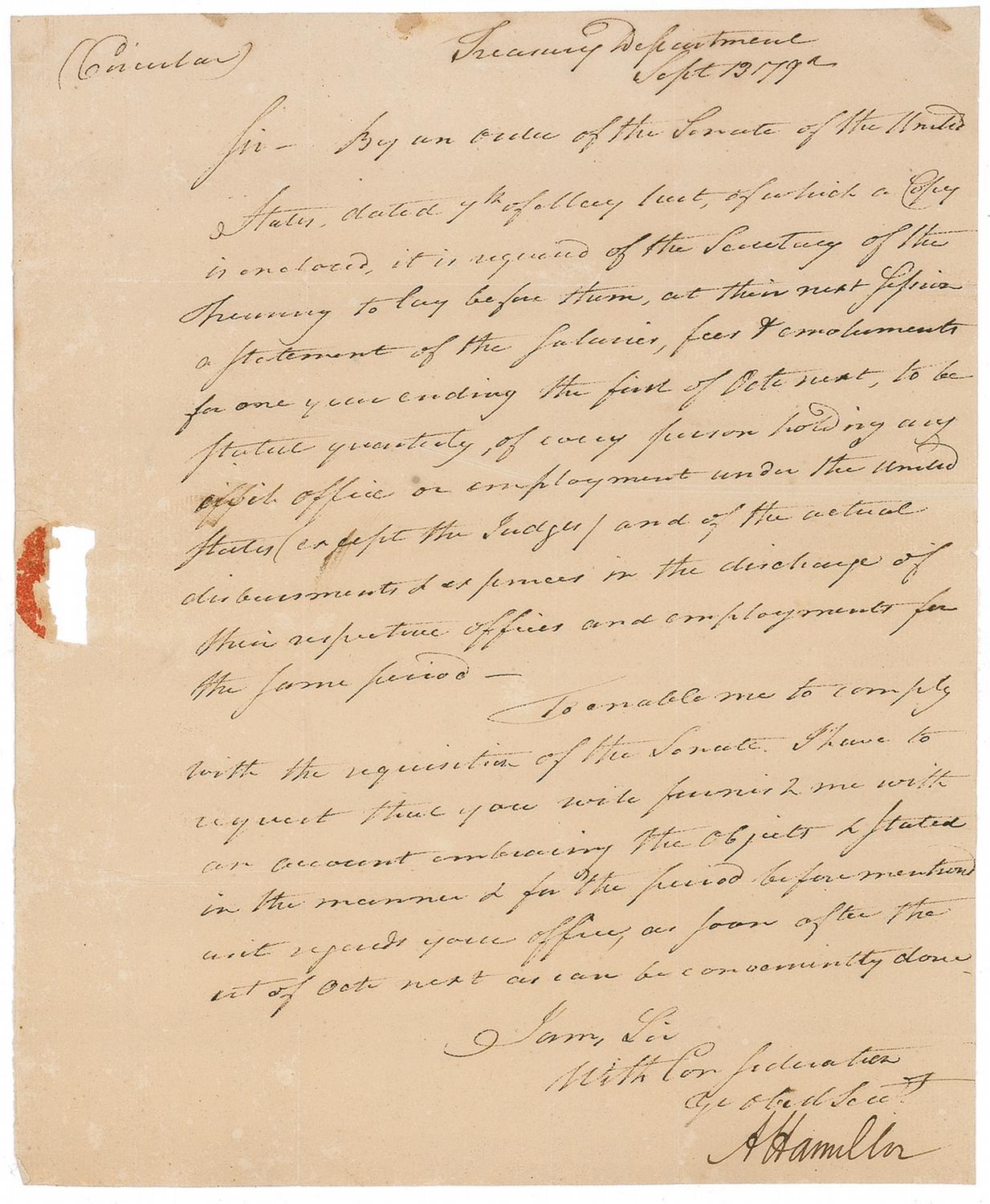 LS signed “A. Hamilton,” one page, 7.25 x 8.75, September 13, 1792. A circular letter (so captioned) regarding the payment of federal employees. In part: “By an order of the Senate of the United States, dated 7th of May last, of which a Copy is enclosed [not present], it is required of the Secretary of the Treasury to lay before them, at their next session a statement of the salaries, fees & emoluments for one year ending the first of Octo[ber] next, to be stated quarterly, of every person holding any office or employment under the United States (except the Judges) and of the actual disbursements & expences in the discharge of their respective offices and employments for the same period….” In very good condition, with several intersecting folds, light wrinkling and creasing, a few small marginal spots, two small areas of thin paper, and seal-related hole to left margin, well away from text.