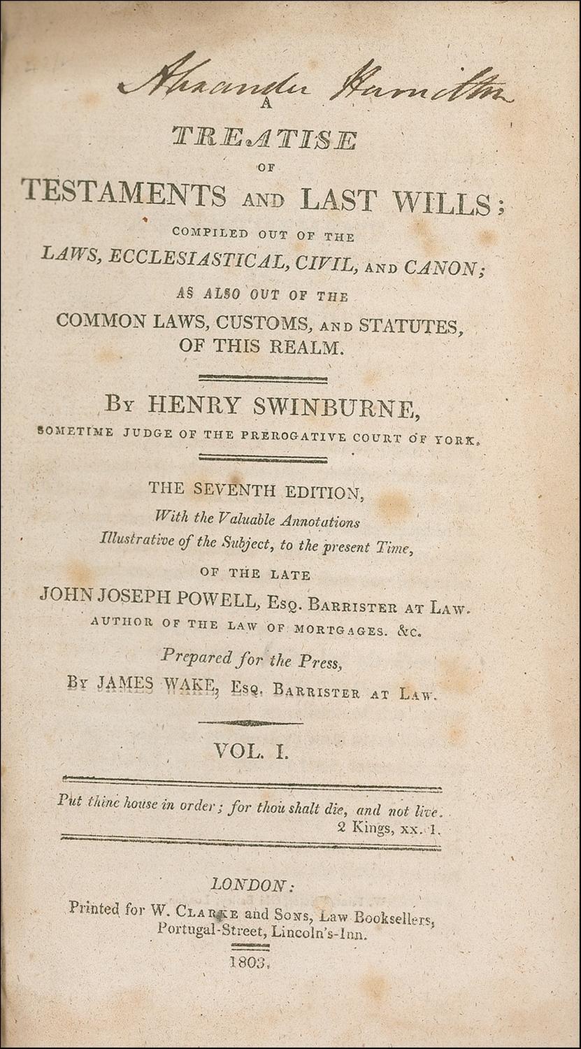 Signed book: A Treatise of Testaments and Last Wills; Compiled Out of the Laws, Ecclesiastical, Civil, and Cannon by Henry Swinburne, Volumes 1-3 . . London: W. Clarke and Sons, 1803. Hardcover, 5.25 x 8.5, 412 pages. Signed at the top of the title page of Volume I by Hamilton, most likely an ownership signature. In good condition, with scattered toning and foxing to signed page, partial hinge separations to first few pages, split along front hinge and cover, and scattered wear, surface loss and flaking to covers, and moderate wear to spine. Remaining two volumes also rate good to very good. Books from Hamilton’s library are seldom offered for auction.