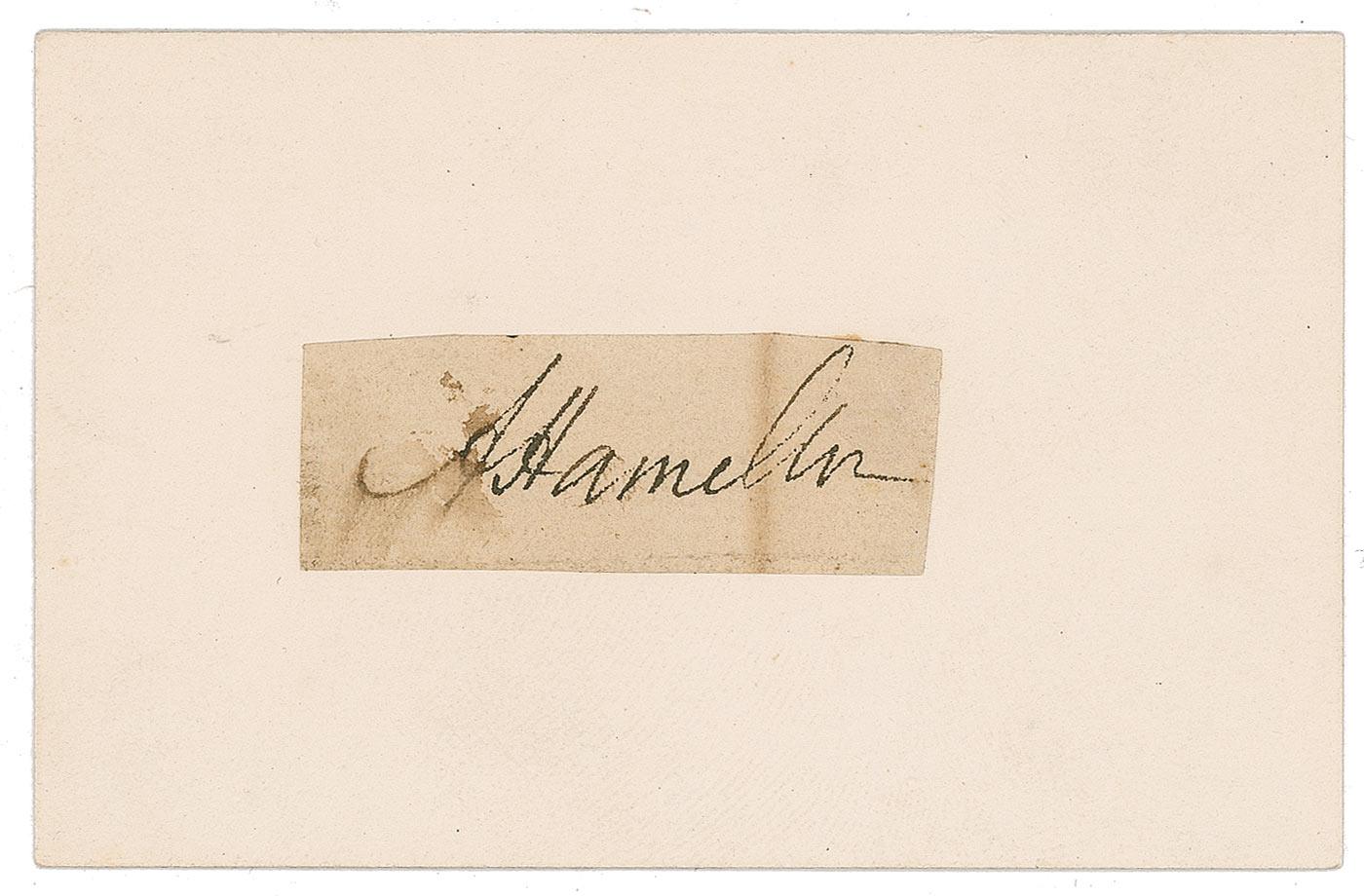 American statesman and politician (circa 1755–1804) who coauthored the Federalist Papers and served as the first secretary of the treasury. In July 1804, sitting Vice President Aaron Burr, stung by a published criticism authored by Hamilton, challenged the esteemed statesman to a duel and fatally wounded him. Ink signature, “A. Hamilton,” on an off-white 1.75 x .5 slip affixed to a 3.5 x 2.25 off-white card. Some scattered toning and damp staining, and a vertical fold through a single letter of signature, otherwise fine condition.