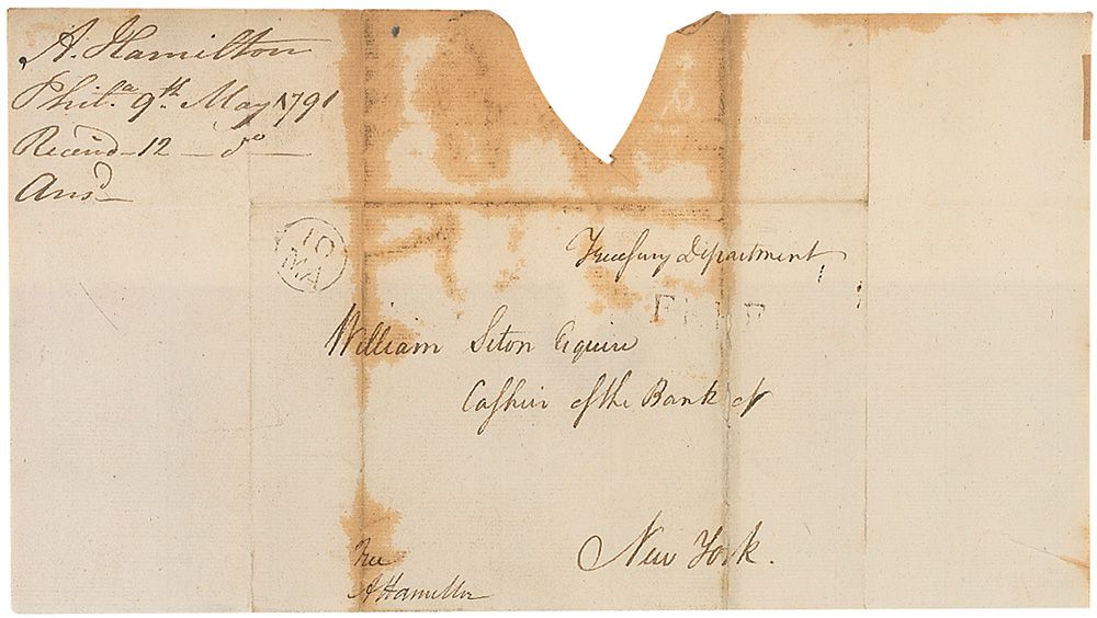 Full free frank, measuring 9 x 7.75 unfolded, with panel measuring 5 x 3.25, addressed in another hand to “William Seton Esquire, Cashier of the Bank of New York,” and franked in the lower left “Free A. Hamilton.” Panel also bears a “Free” stamp, a notation “Treasury Department” in the upper right and a docketing notation to left edge. In very good condition, with two vertical folds through panel, one through first letter of signature, scattered toning, a bit lightly affecting signature, a bit of paper loss along vertical folds, a few creases, and paper loss to top and bottom edge.