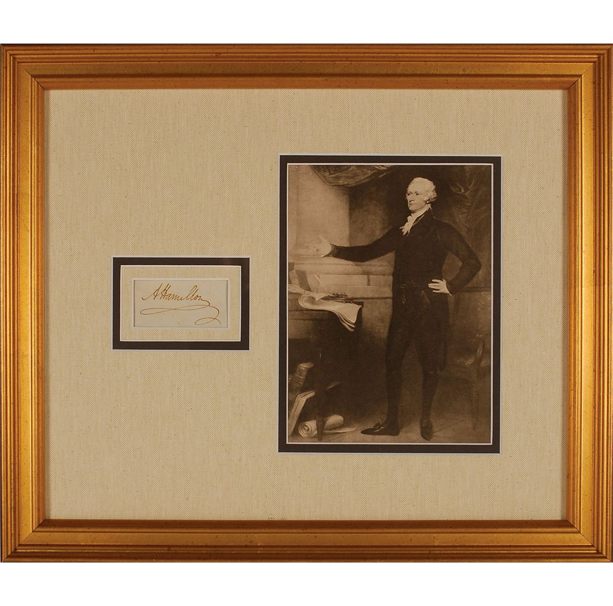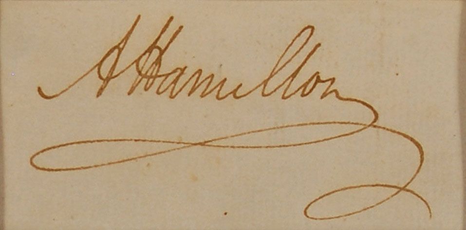 Ink signature, “A. Hamilton,” on an off-white 2.75 x 1.5 slip. Attractively double-cloth-matted and framed with a portrait of Hamilton to an overall size of 18 x 15.25. In fine condition.