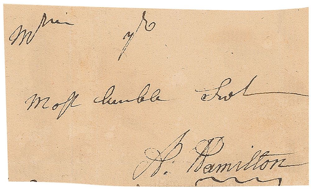 Ink signature, “yr. Most humble Sevt., A. Hamilton,” on an off-white 2.75 x 1.75 slip clipped from the close of a letter. Affixed to a slightly larger slip. In fine condition, with an unobtrusive horizontal fold passing through the signature.