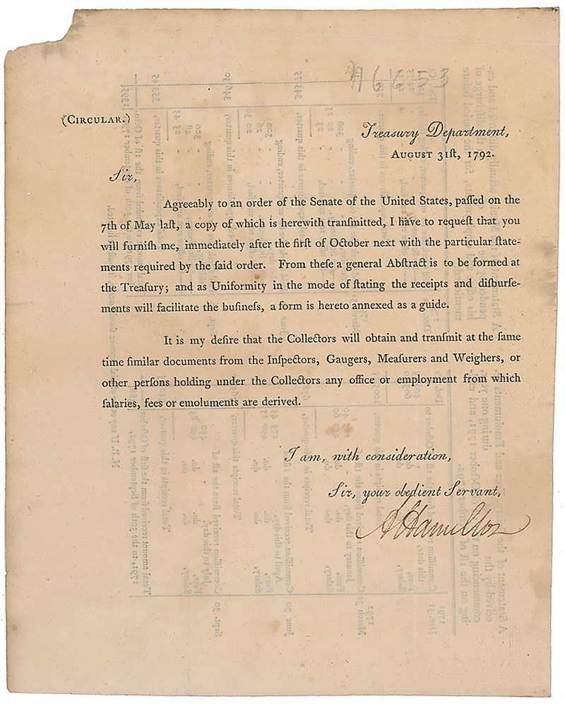 Scarce DS, signed “A. Hamilton,” one page, 7.25 x 9, August 31, 1792. Printed Treasury Department circular. In part: “Agreeably to an order of the Senate of the United States…I have to request that you will furnish me…with the particular statements required by the said order…as Uniformity in the mode of stating the receipts and disbursements will facilitate the business, a form is hereto annexed as a guide…Collectors will obtain and transmit at the same time similar documents from the Inspectors, Gaugers, Measurers and Weighers, or other persons…from which salaries, fees or emoluments are derived.” In fine condition, with intersecting folds, some light scattered staining, and a bit of paper loss to upper left corner. This interesting financial document dates to shortly after Hamilton deftly managed to resolve the Panic of 1792, precipitated by a crash in the price of securities in combination with overextended credit. Hamilton was able to introduce measures to restore confidence in the markets and used the Treasury to buy back securities; his actions were able to stabilize the crisis within just one month, avoiding a prolonged recession.