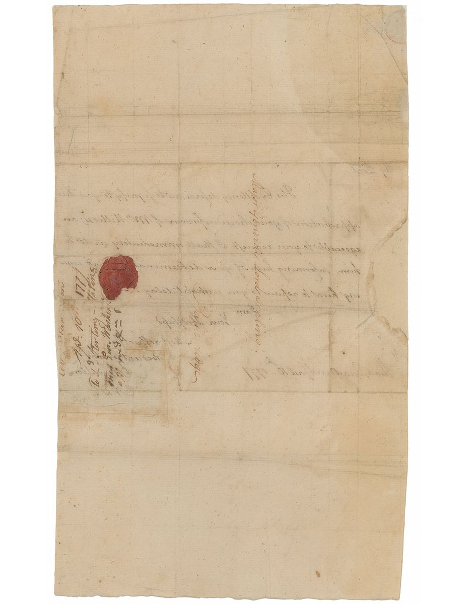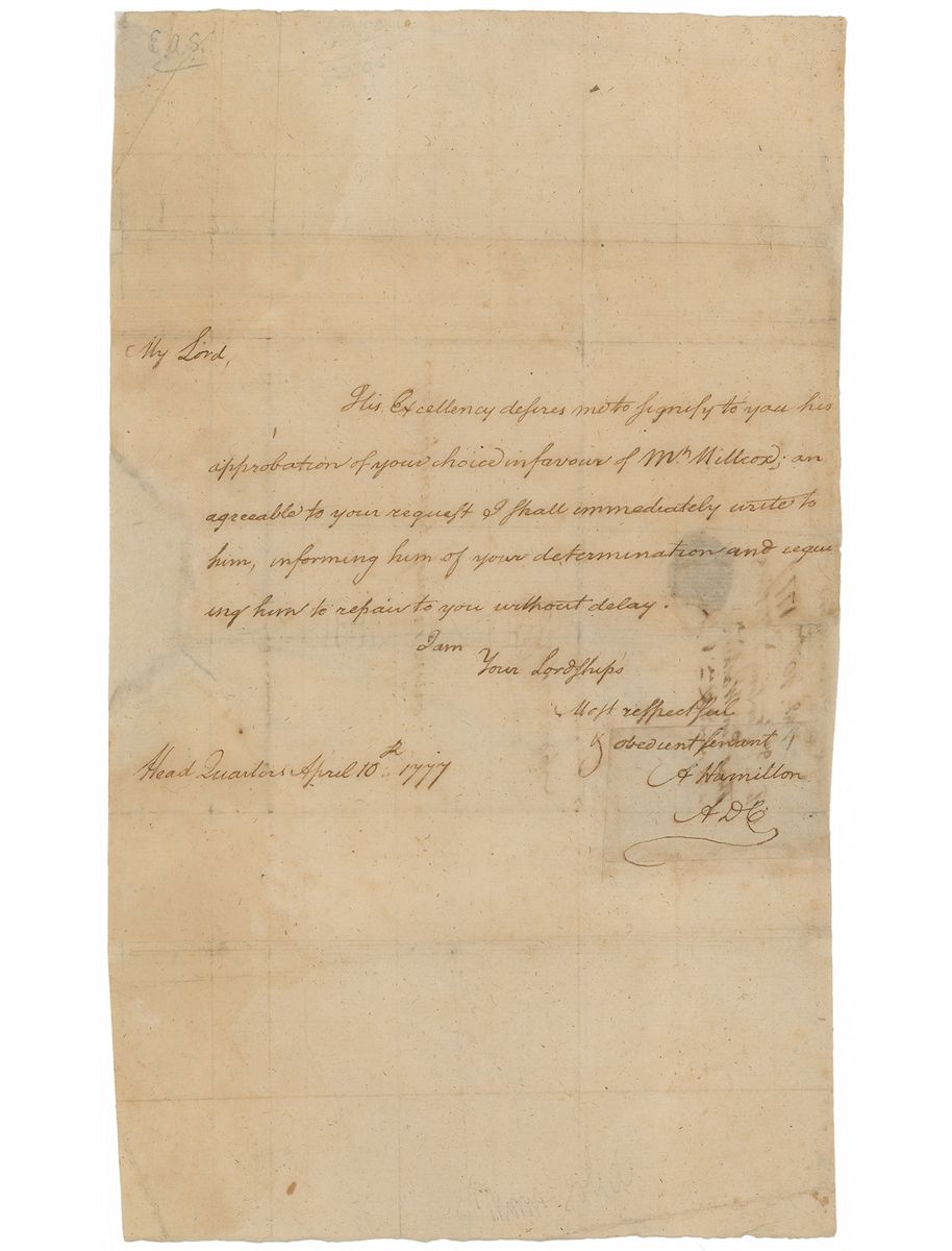 Rare and very desirable war-dated ALS signed “A. Hamilton,” one page, 7.75 x 13, April 10, 1777. Letter to Major General Lord Stirling, in full: “His Excellency desires me to signify to you his approbation of your choice in favor of Mr. Willcox; and agreeable to your request I shall immediately write to him, informing him of your determination and requesting him to repair to you without delay.” Encapsulated in a Mylar sleeve. Professionally restored to very good condition, with repairs to partially separated intersecting folds, tears, and paper loss to edges (notably to the left edge from seal removal); the signature area apparently precisely clipped out at some point and now restored to original condition; show-through from docketing to reverse affecting the signature area; and some scattered tiny holes (one affecting the tip of the "A" in the signature).