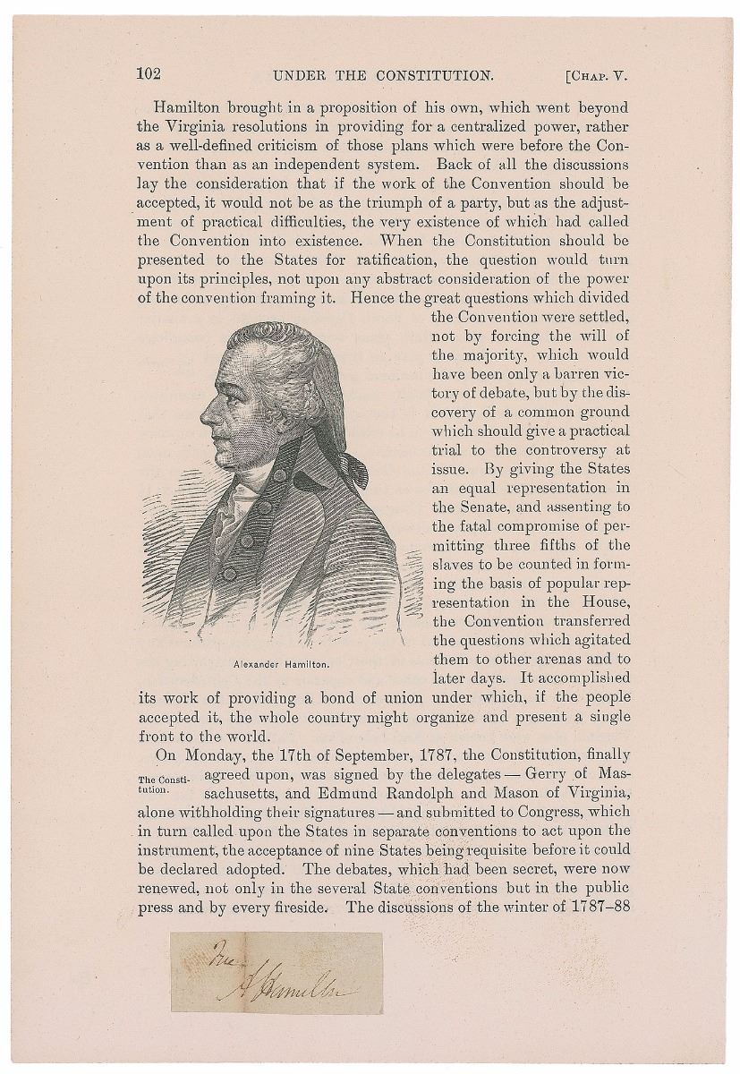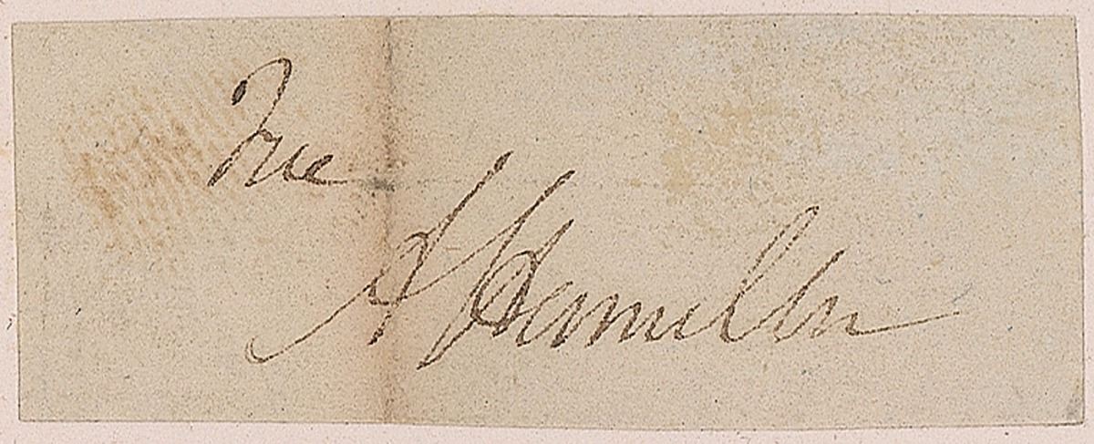 Ink free frank signature, “Free, A. Hamilton,” on an off-white 1.75 x .75 slip clipped from an address panel. Affixed in the lower margin of a book page depicting the esteemed statesman. A toned vertical fold passing through his first initial, and light toning, otherwise fine condition.