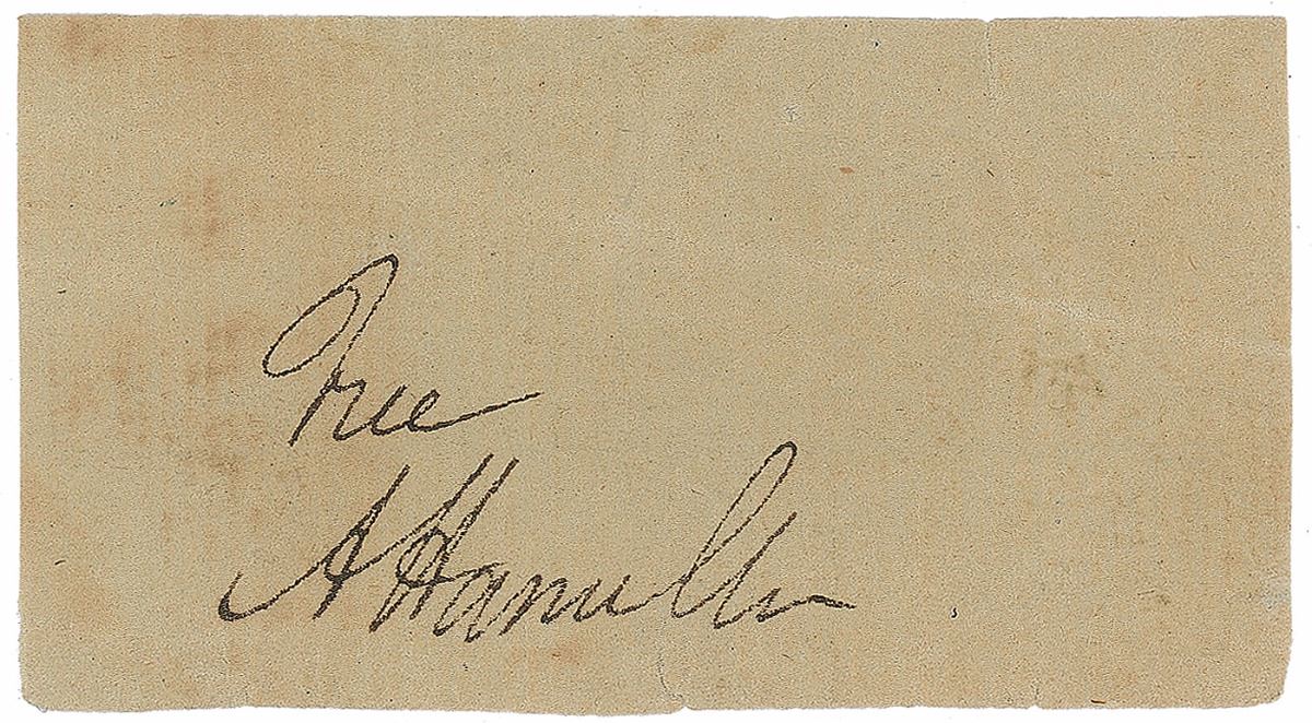 Extremely desirable crisp ink signature, “Free, A. Hamilton,” on an off-white 2.5 x 1.5 slip clipped from a free frank. In fine condition, with a light diagonal crease and scattered soiling.