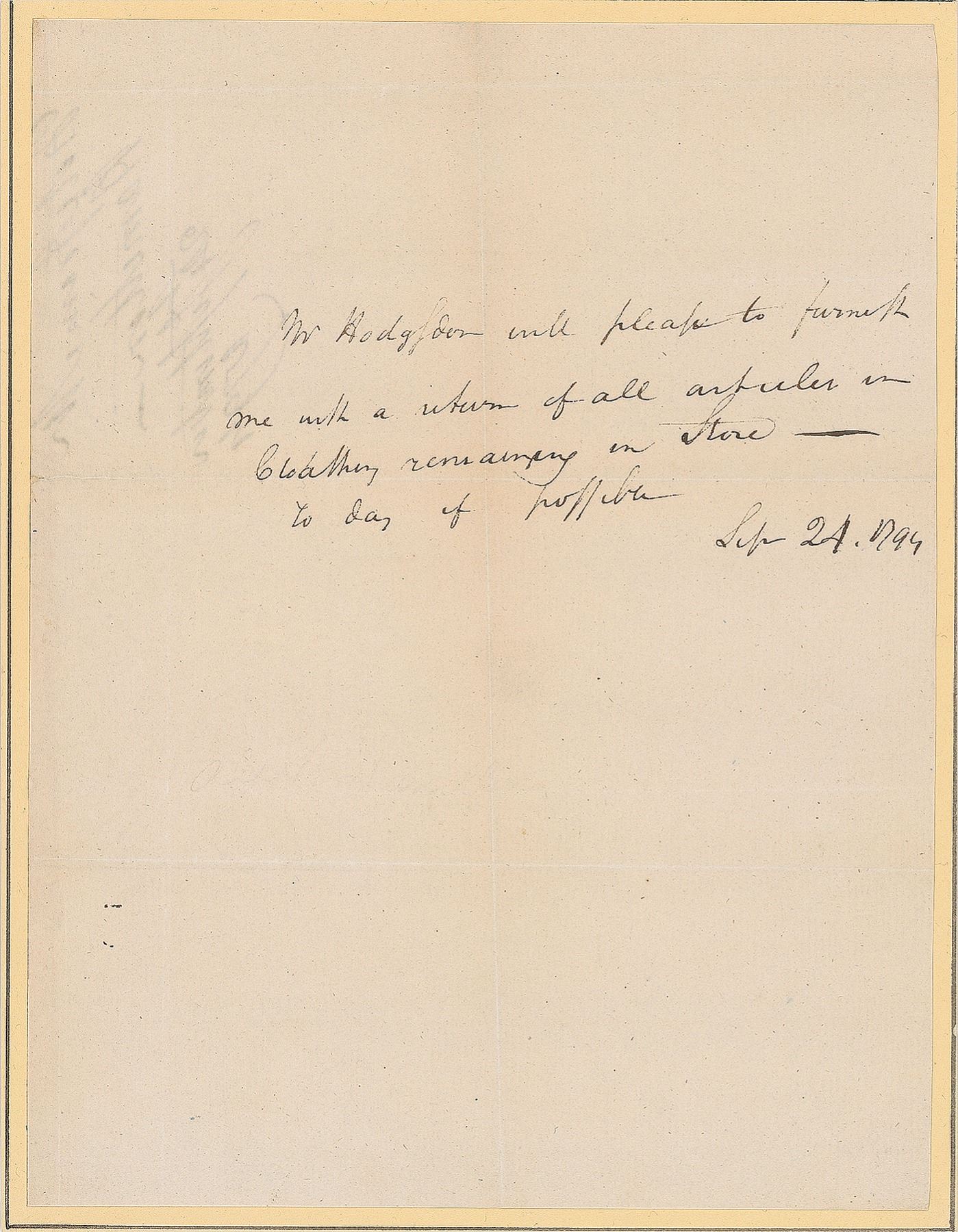 Sought-after note written in the hand of Alexander Hamilton, unsigned, one page, 6 x 7.75, September 24, 1794. Note to Samuel Hodgson, the superintendent of military stores, in full: "Mr. Hodgson will please to furnish me with a return of all articles in Cloathing remaining in Store—to day if possible." Affixed along the left edge to a slightly larger sheet. In fine condition, with trimmed edges, and a docketing notation lightly showing through from the reverse. On September 19, 1794, Hamilton issued a request to President Washington asking permission to send military to western Pennsylvania as a means of quelling the Whiskey Rebellion. The clothing referenced in this note were thus intended for the militia soon to head to the state's southwestern revolts.