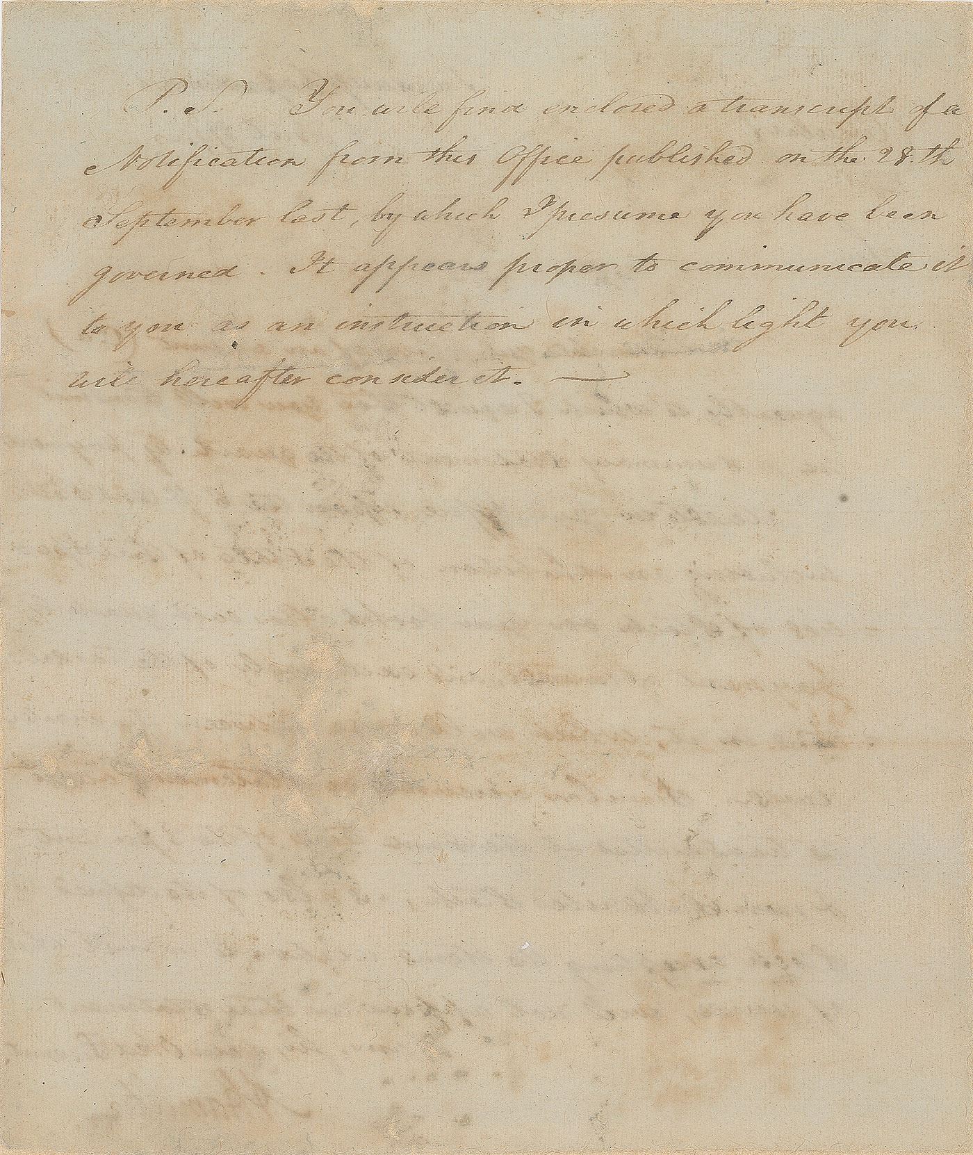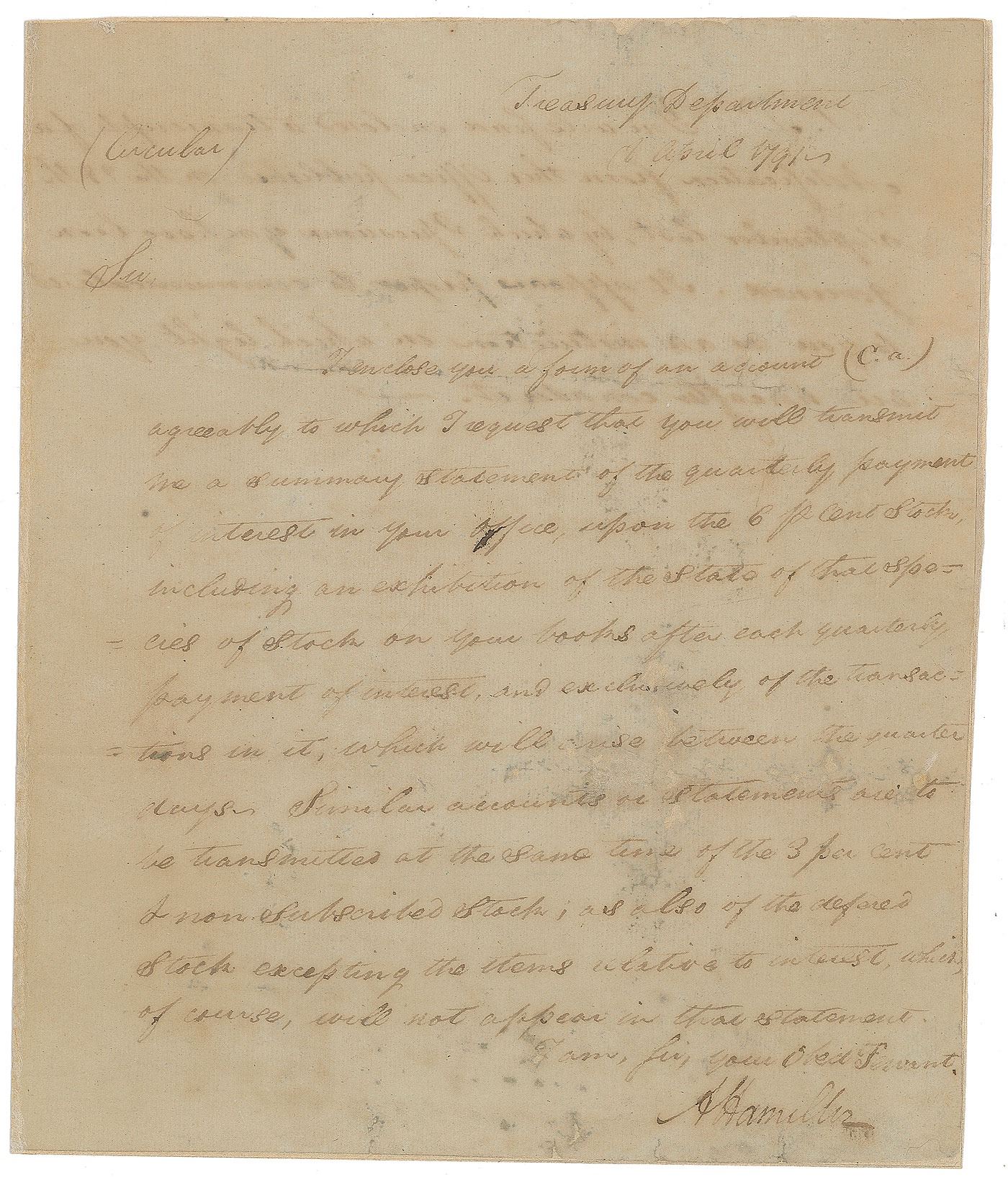 LS signed “A. Hamilton,” one page both sides, 7.5 x 9, April 8, 1791. Written from the Treasury Department, in full: "I enclose you a form of an account (c.a.) agreeably to which I request that you will transmit me a summary statement of the quarterly payment of interest in your office, upon the 6 p'cent stocks, including an exhibition of the Stats of that species of stock on your books after each quarterly payment of interest, and exclusively of the transactions in it, which will arise between the quarter days. Similar accounts or statements are to be transmitted at the same time of the 3 per cent & non subscribed stock, as also of the defered [sic] stock excepting the items relative to interest, which, of course, will be appear in that statement." The letter is headed "Circular" in the upper left and has a postscript on the reverse: "You will find enclosed a transcript of a notification from this office published on the 28th September last, by which I presume you have been governed. It appears proper to communicate it to you as an instruction in which light you will hereafter consider it." Professionally restored to near-fine condition, with replaced areas of paper loss and complete overall silking for reinforcement.