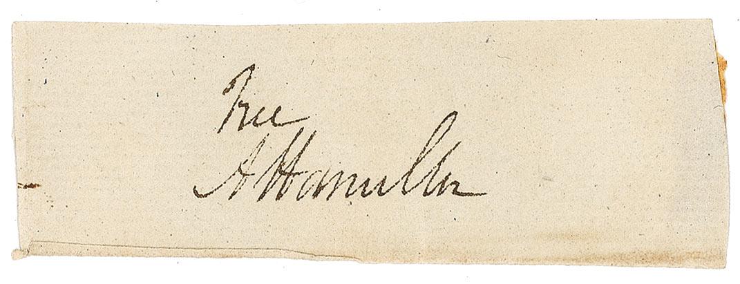 Ink franking signature, “Free, A. Hamilton,” on an off-white 2.5 x 1 slip. In fine condition, with a barely visible central vertical fold through a single letter of signature.