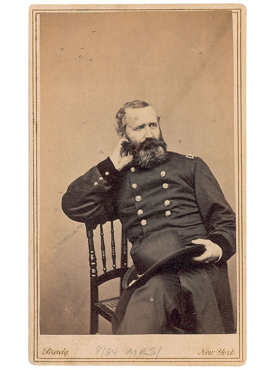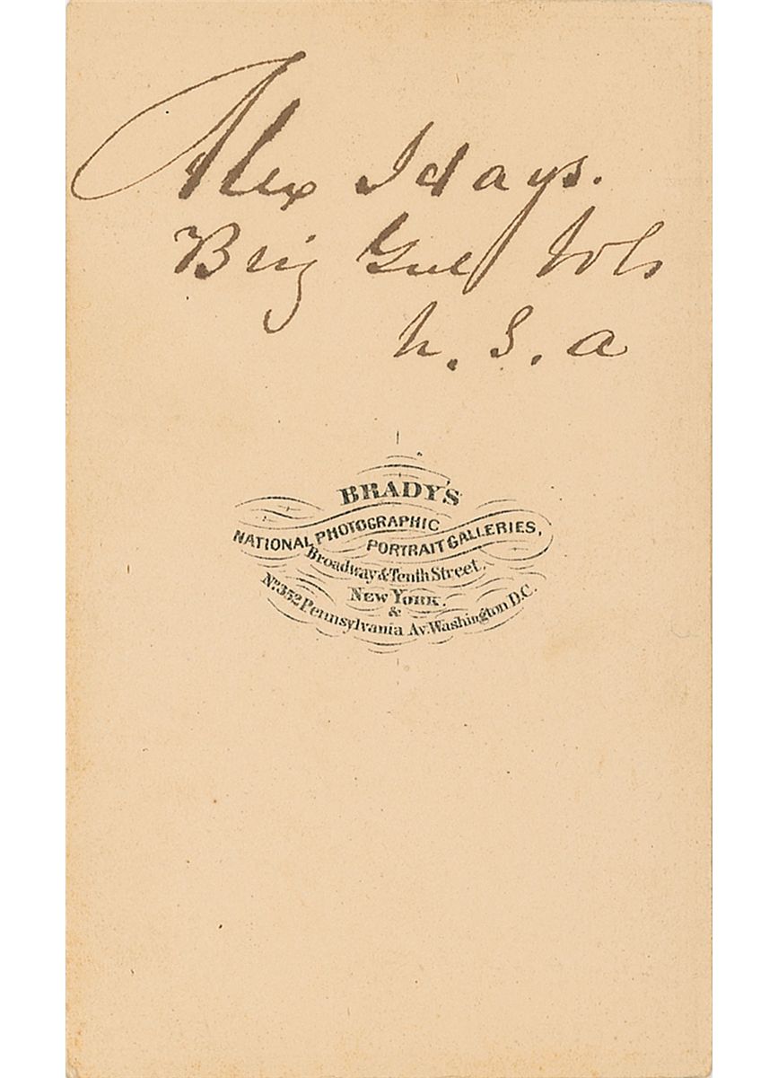 Union general who was killed in action on May 5, 1864, in the Battle of the Wilderness. Original 2.25 x 4 carte-de-visite photo of Hays seated in a chair, his hat on his lap, by Brady, signed on the reverse in black ink, “Alex. Hays, Brig Genl Vols, U.S.A.” In fine condition, with pencil notations to lower border of front and a bit of light soiling.
