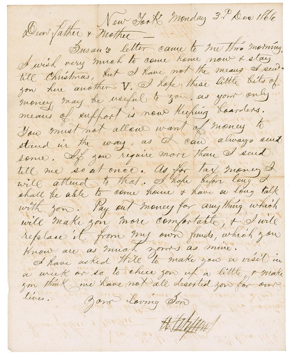 American landscape painter (1836–1892) who achieved distinction for his subtle, delicate treatment of scenes in the Adirondacks and Catskills and of peaceful rural landscapes. ALS signed “A. H. Wyant,” one onionskin page, 8 x 10, December 3, 1866. Wyant writes his mother and father from New York City. In part: “I wish very much to come home now & stay till Christmas, but I have not the means…I hope these little bits of money may be useful to you, as your only means of support is now keeping boarders. You must not allow want of money to stand in the way, as I can always send some. If you require more than I send tell me so at once. As for tax money I will attend to that. I hope before long I shall be able to come home & have a long talk with you. Pay out money for anything which will make you more comfortable, & I will replace it from my own funds, which you know are as much yours as mine.” In very good condition with intersecting horizontal and vertical folds, scattered toning, a block of uniform toning to the central horizontal panel, and slight mirroring of text.
