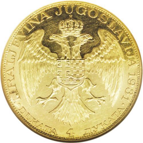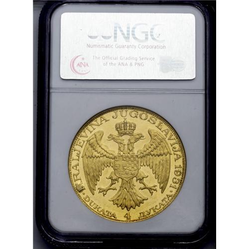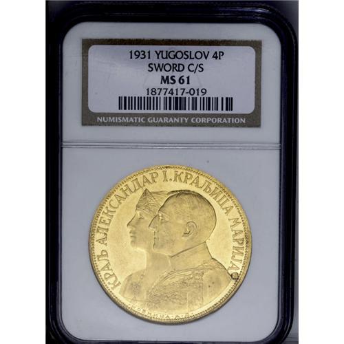 <B>Alexander I gold 4 Dukata 1931 Sword, </B></I>KM14.1, MS61 NGC, prooflike surfaces with small scratches in the obverse fields.