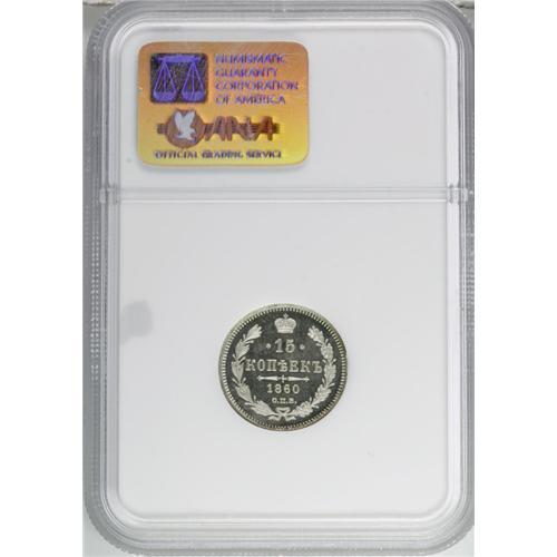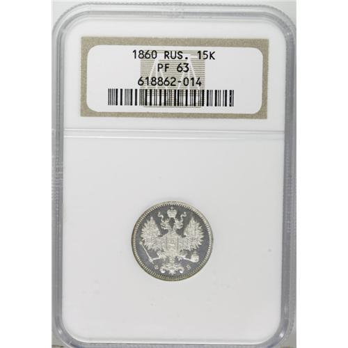 <B>Alexander II 15 Kopecks 1860 C??- ??,</B></I> small crown, Bit-183, Proof 63 NGC. Brilliant white with nice cameo contrast and a few minute marks.<BR><BR><b>Shipping:</b> Coin/Currency (<a target="_blank" href="http://www.heritageauctions.com/common/shipping.php">view shipping information</a>)