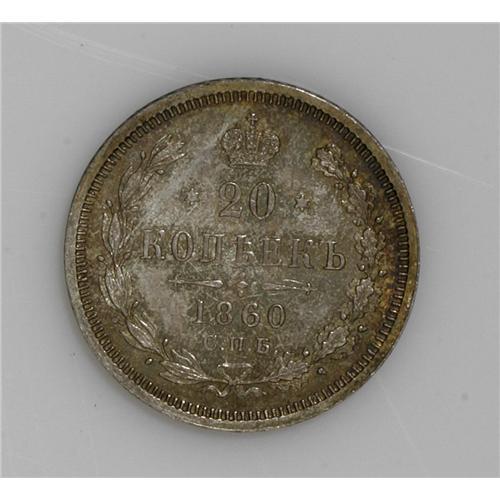 <B>Alexander II 20 Kopecks 1860 C??-??,</B></I> Bit-161, UNC. Well struck with nice toning and very minor obverse rim bumps. A very scarce issue.
