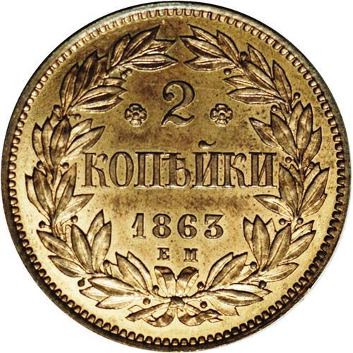 <B>Alexander II. Bronze Pattern 2 Kopecks 1863-EM (Brussels Mint),</B></I> Bit-600 (R2), Uzd-4040, Choice prooflike UNC with a majority of the original mint-red color remaining.
