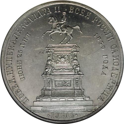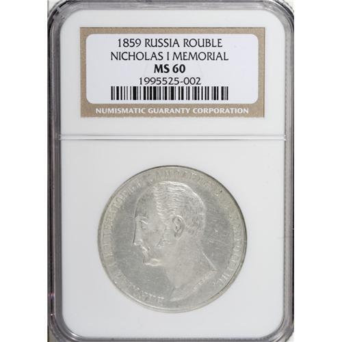 <B>Alexander II. Nicholas I Commemorative Rouble 1859,</B></I> by Lyalin, Bit-567, MS60 NGC. Well struck with moderate abrasions and hairlines. Both sides exhibit prooflike fields.<BR><BR><b>Shipping:</b> Coin/Currency (<a target="_blank" href="http://www.heritageauctions.com/common/shipping.php">view shipping information</a>)