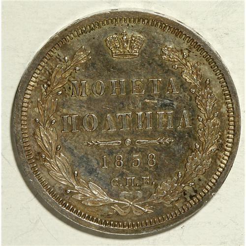 <B>Alexander II. Poltina 1858 C??-??,</B></I> Bit-52, well struck and lustrous, Choice AU with golden-gray patina.<BR><BR><b>Shipping:</b> Coin/Currency (<a target="_blank" href="http://www.heritageauctions.com/common/shipping.php">view shipping information</a>)