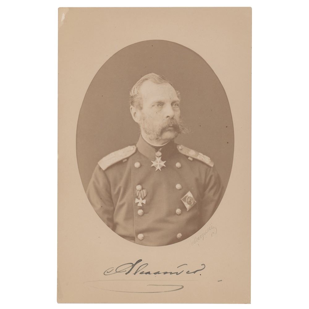 Rare 4 x 6.5 cabinet photo of the Russian emperor in uniform, nicely signed below the image in ink. A notation on the reverse reads: "Given us by the Emperor Alexander 2nd, 1879." In fine condition, with a few small edge creases, and a small area of emulsion loss to the upper left corner tip.