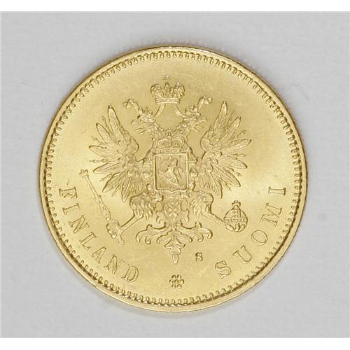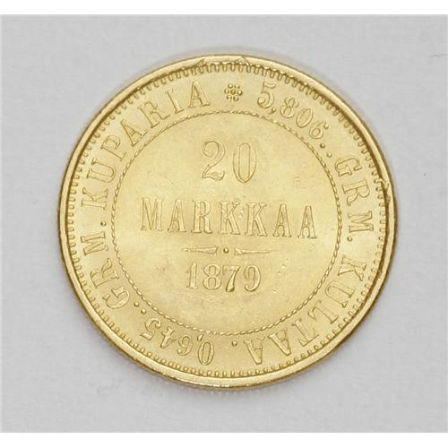 <B>Alexander II gold 20 Markkaa 1879, </B></I>KM9.2, brilliant UNC, few tiny contact marks.<BR><I> From the Dr. & Mrs. E.E. Banfield Collection.</B></I>