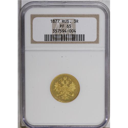<B>Alexander II gold 3 Roubles 1877 C??-H?,</B></I> F-164, Bit-40, Proof 65 NGC. Fully mirrored fields with some cameo contrast. Rare in this Gem condition.<BR><BR><b>Shipping:</b> Coin/Currency (<a target="_blank" href="http://www.heritageauctions.com/common/shipping.php">view shipping information</a>)