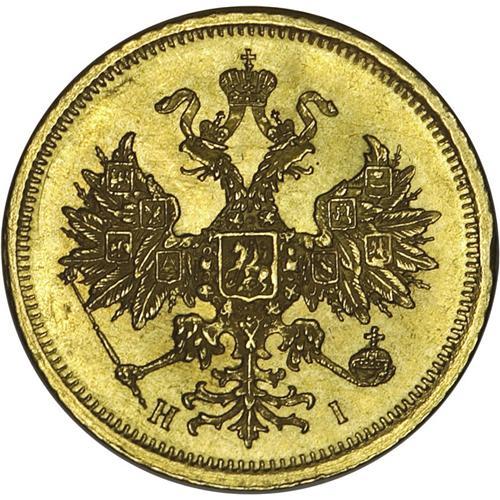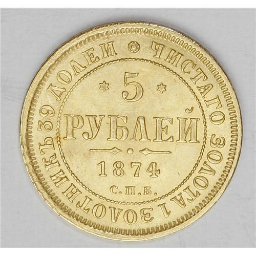 <B>Alexander II gold 5 Roubles 1874 C??-HI,</B></I> F-163, Bit-22, nice UNC, nearly Choice. Well struck, with full luster and minimally abraded surfaces.<BR><BR><b>Shipping:</b> Coin/Currency (<a target="_blank" href="http://www.heritageauctions.com/common/shipping.php">view shipping information</a>)