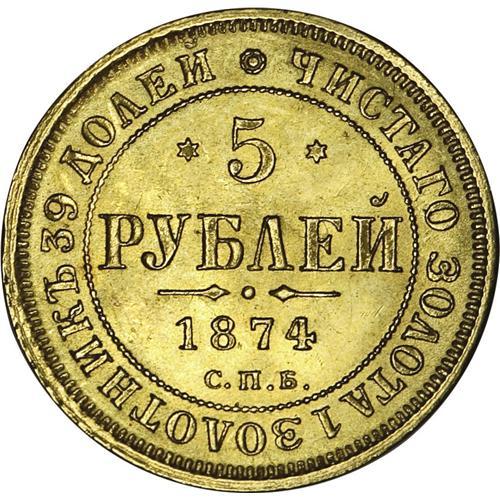 Alexander II gold 5 Roubles 1874 C??-HI, F-163, Bit-22,
