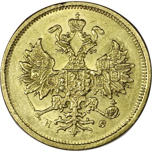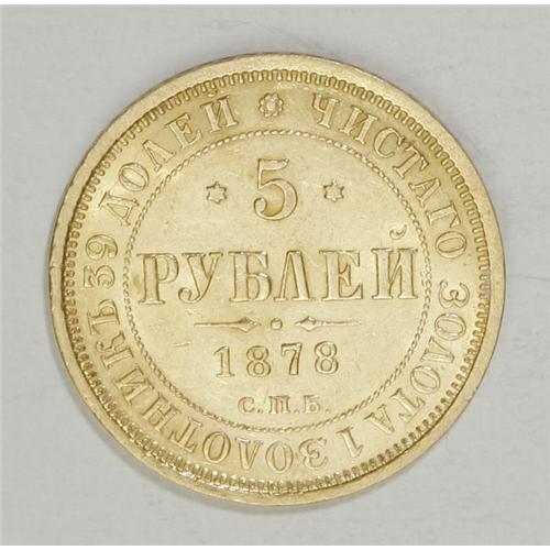 <B>Alexander II gold 5 Roubles 1878 C??-H?,</B></I> F-163, Bit-27, lustrous AU with an obverse rim bump between 11 and 12 o’clock.<BR><BR><b>Shipping:</b> Coin/Currency (<a target="_blank" href="http://www.heritageauctions.com/common/shipping.php">view shipping information</a>)