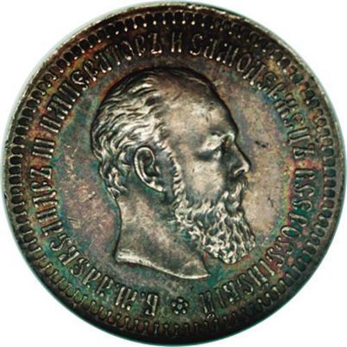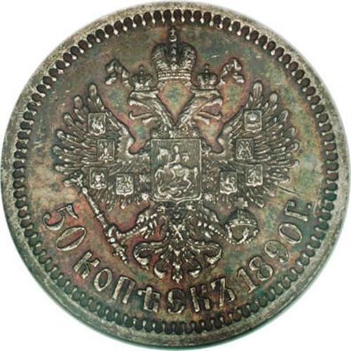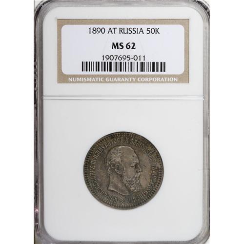 <B>Alexander III 50 Kopecks 1890 A?,</B></I> Bit-83, R.1, MS62 NGC. Well struck with bluish-gray toning.<BR><BR><b>Shipping:</b> Coin/Currency (<a target="_blank" href="http://www.heritageauctions.com/common/shipping.php">view shipping information</a>)