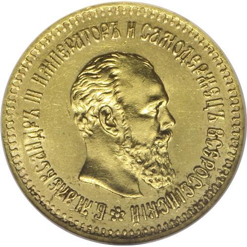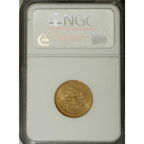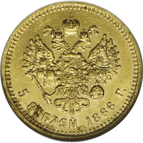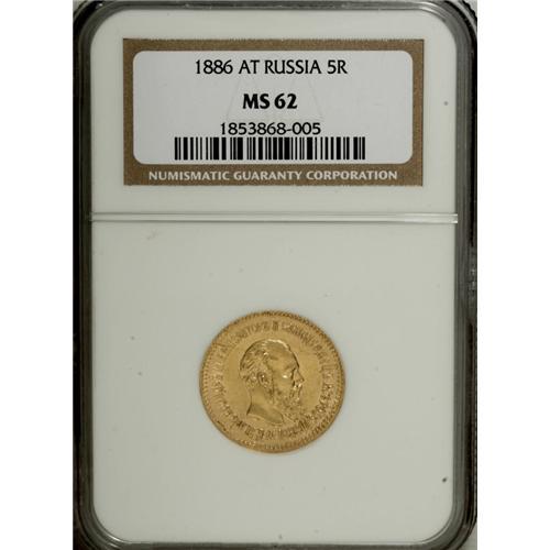 <B>Alexander III. Gold 5 Roubles 1886 A?,</B></I> Bit-24, MS62 NGC. Brilliant luster with moderate contact marks.<BR><BR><b>Shipping:</b> Coin/Currency (<a target="_blank" href="http://www.heritageauctions.com/common/shipping.php">view shipping information</a>)