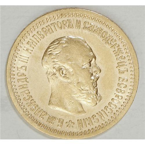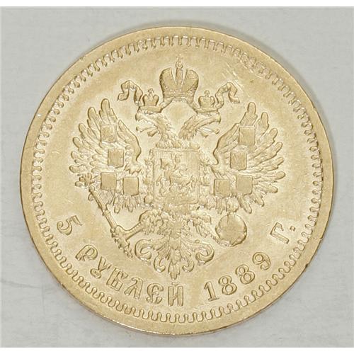<B>Alexander III. Gold 5 Roubles 1889 A?- A?,</B></I> AF on truncation of neck, F-169, Bit-34, lustrous XF.<BR><BR><b>Shipping:</b> Coin/Currency (<a target="_blank" href="http://www.heritageauctions.com/common/shipping.php">view shipping information</a>)