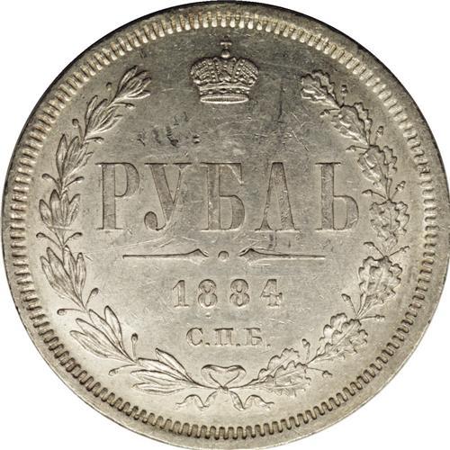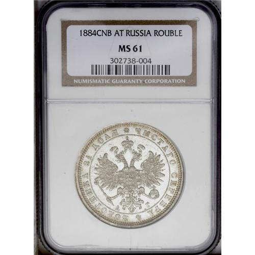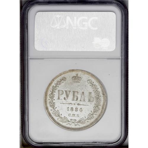 <B>Alexander III. Rouble 1884 C-,</B></I> Bit-45, Uzd-1987, Julian-1177, MS61 NGC. A touch of golden toning with nice luster and the normal marks that one might expect of this grade.<BR><I>From the St. Petersburg Collection.</B></I>