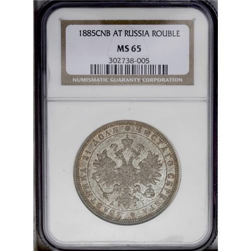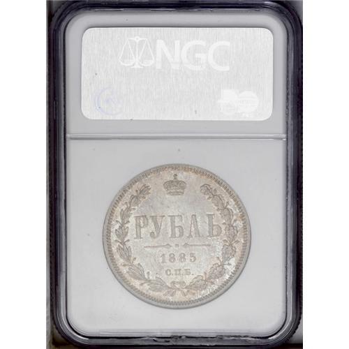 <B>Alexander III. Rouble 1885 C-,</B></I> Bit-46, Uzd-1994, Julian-1178, MS65 NGC. Superb, original sea-green toning over full luster.<BR><I>From the St. Petersburg Collection.</B></I>