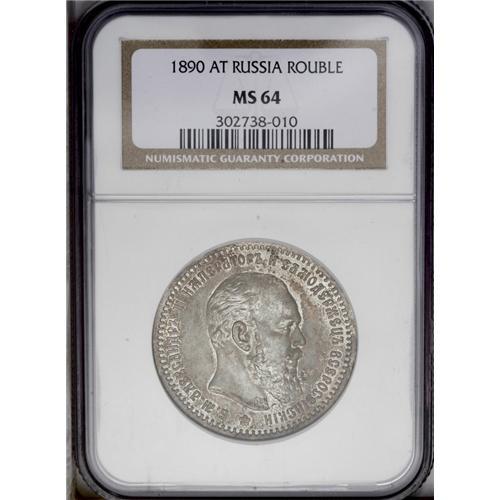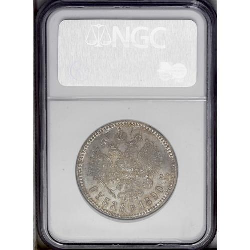 <B>Alexander III. Rouble 1890 -,</B></I> Bit-73, Uzd-2033, Julian-1190, MS64 NGC. Fully struck and lustrous with mottled gray, gold, and sea-green toning. Scarce in this condition.<BR><I>From the St. Petersburg Collection.</B></I>