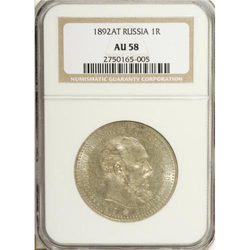<B>Alexander III Rouble 1892 A?,</B></I> portrait of 93-94, Bit-76, AU58 NGC. Bright and lustrous with lightly abraded surfaces.<BR><BR><b>Shipping:</b> Coin/Currency (<a target="_blank" href="http://www.heritageauctions.com/common/shipping.php">view shipping information</a>)
