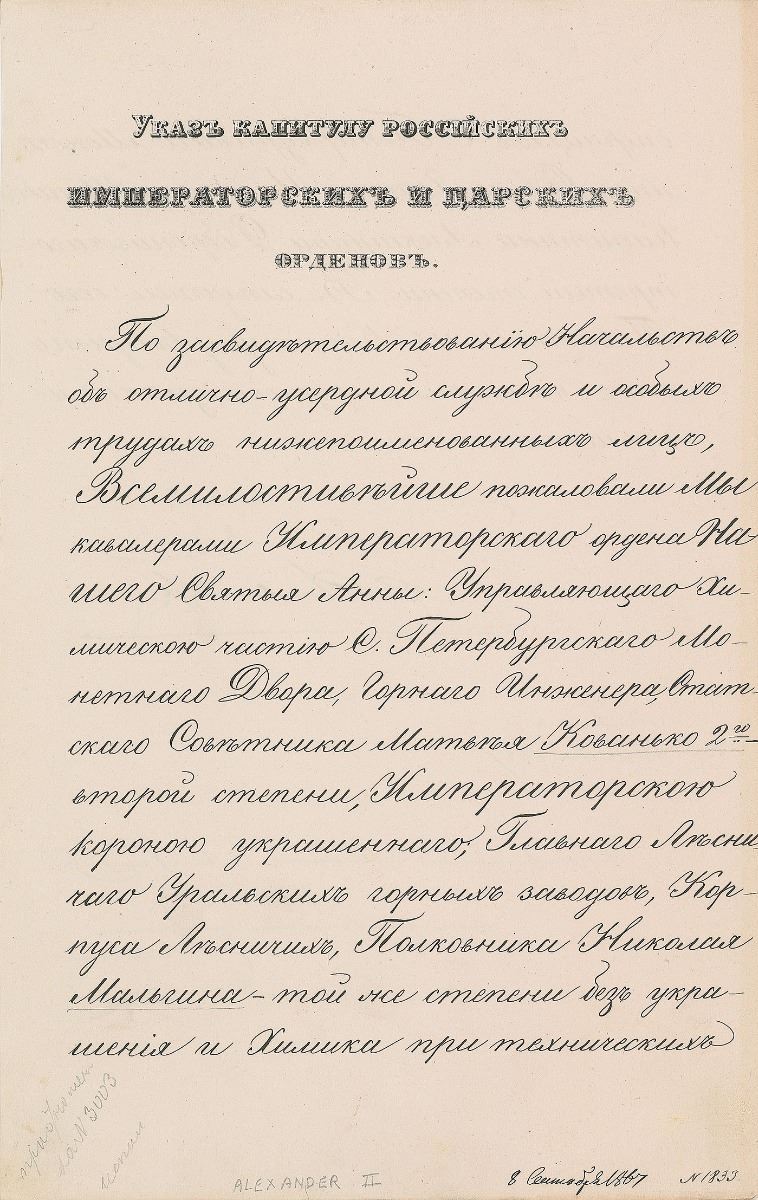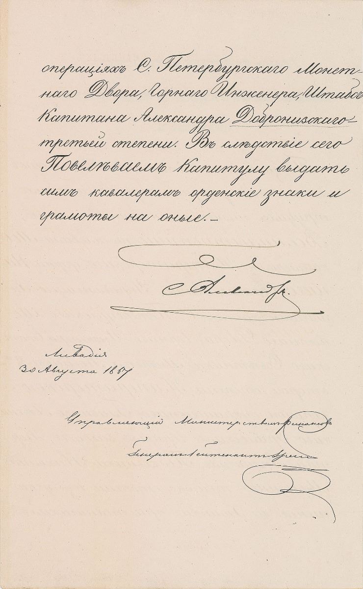 Emperor of Russia until his assassination in 1881 (born 1818), who also served as the King of Poland and the Grand Duke of Finland; became known as Alexander the Liberator for his emancipation of Russia's serfs in 1861. Attractive manuscript DS, in Russian, signed “Aleksandr,” one page both sides, 8.5 x 14, August 30, 1867. An Imperial Decree to the Chapter of Russian Imperial and Royal Orders, in which Alexander appoints five military officers, in part (translated): "In accordance with the testimony of Command concerning the excellently spirited and zealous service of the staff and senior officers of the Mountain Guards named below, We Most Graciously have bestowed the title of cavalier of Our Imperial order of Saint Anna, third class…In consequence of this, We Command the Chapter to issue these cavaliers the medals and documents for the above." Signed boldly at the conclusion by Alexander. In fine condition.